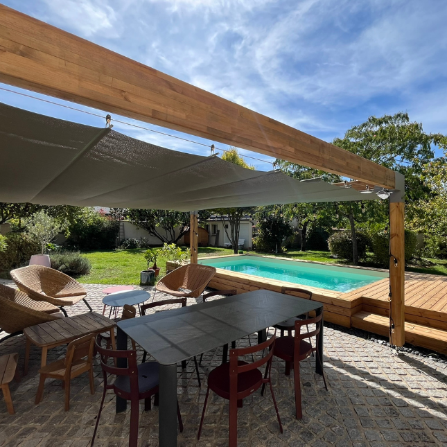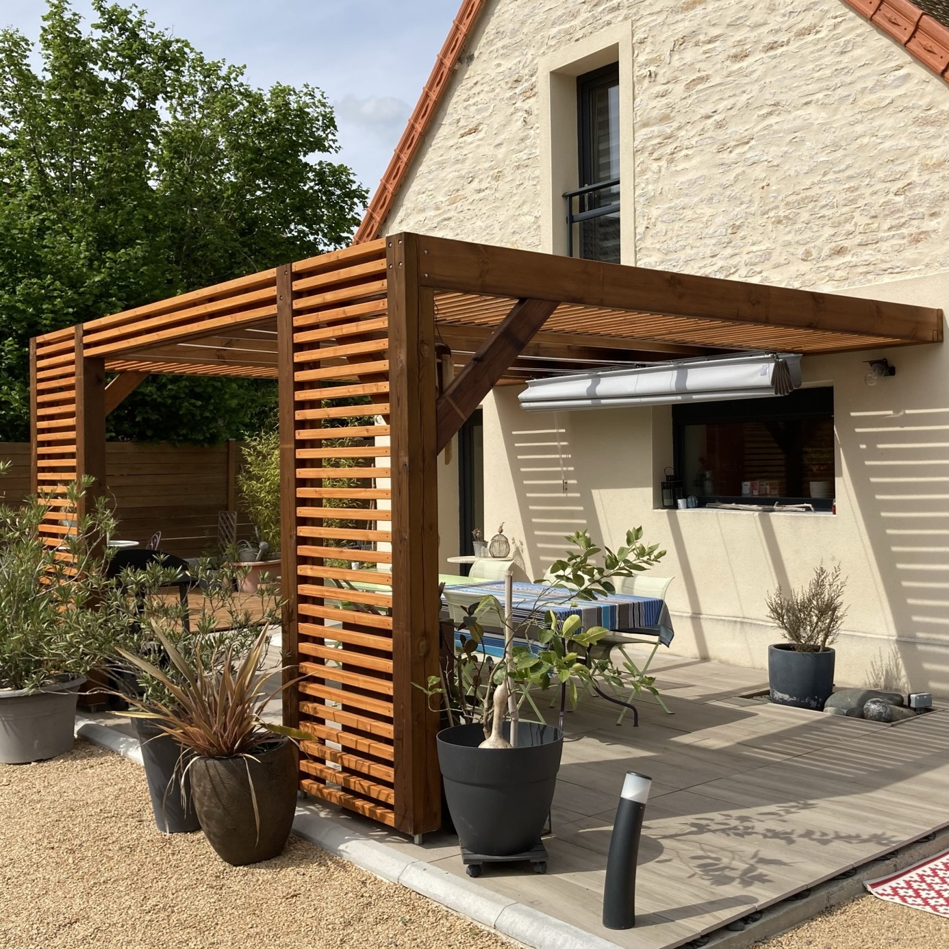 Je fabrique également des pergolas traditionnelles ou contemporaines, en bois, aluminium ou bi-matière, avec intégration possible de toiles anti-UV et de stores motorisés pour une protection solaire optimale.